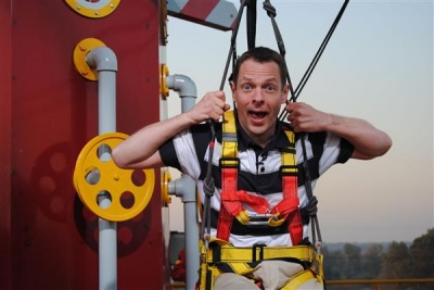 - 69 - The Big Zipper - Contestants stand facing backwards on diving boards, whilst holding onto a zip-line overhead. The contestant with the wrong answer sees their diving board retracted, allowing gravity to take over, and they descend the 250 foot zip-line to the ground.