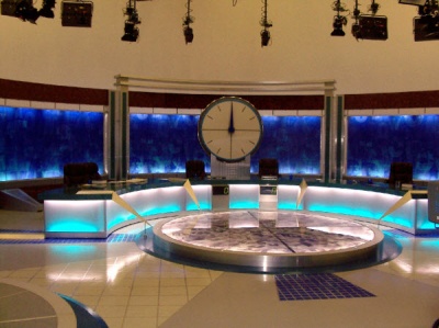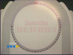 One of the most common questions about the show is whether the clock goes all the way round. And the answer is: yes, it does. The hand moves clockwise all the way round back to the top. In the early days it took 30 seconds to do this, but nowadays it whizzes round in four or five seconds. When they originally designed it for Calendar Countdown, the clock clearly had bulbs up to to 45 seconds even though only 30 were used, because no one was sure how long the rounds should last when the set was built. On the earliest version of the main clock, which curiously had no markings on it, you could see that the clock also had lights up to 45 seconds. There are bulbs in the left-hand side but they're not connected up, they're just spares. When Noel Edmonds did his "Gotcha" on Richard Whiteley, in one round the music had been specially re-edited to go on for 40 seconds, but the clock still stopped at 30.