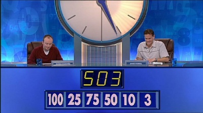 Three (originally two) numbers games where players use their arithmetical skills in order to get to a target number using only the six numbers they've got and the four basic number operations. The numbers are chosen from a board which contains the numbers from 1 to 10 twice over, and one each of 25, 50, 75 and 100. Contestants can ask for any combination of small and large numbers, but they are drawn at random from within each group. Contestants often ask for certain patterns, such as one from the top and five from a given row, an "inverted T" (six tiles whose removal leaves that shape on the board), or a "Whitehall" (one from the top, two from the second row, one from the third and two from the fourth, referring to the old Metropolitan Police phone number, "Whitehall 1212"). An electronic computer called CECIL selects a target number from 100 to 999 inclusive at random. After thirty seconds, the solutions are checked. Ten points if you can get the number spot on, seven points if you're within five, and five points if you're within ten. Only the contestant that is closest to the target gets the points, though.