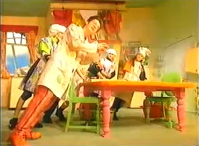 The fifth game is a quickfire round inside the cottage with the two teams each using a communal buzzer shaped like a trifle (they get to "push their puds". Oo-er!) and consists of 18 or 19 questions, all buzz-in, worth 10 points apiece. Yep, it's last-round-blows-all-the-others-out-of- the-water-points-wise syndrome, and don't you just love it. The first two questions are, sat upside-down on the sofa, identify pictures of landmarks; the next three are identify celebrities from pictures (with fake beards, hair etc. added) and the next three are identify theme songs and tunes mangled up. The last bit is that a picture is shown with about 10 weird things in it (a picture of a row of houses with a bookcase on top of a house, a shoe on top of a hedge, potatoes instead of windows, knights in shining armour and so on). Buzz madly in and name them for 10 points apiece. Game-imbalancing!