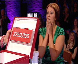 There is an offer after the first five boxes are opened, and then after every third box until there are just two boxes left. In theory, these offers should come slightly below the arithmetic mean of the remaining boxes; in practice, the early offers are artificially low. As a result, the deal almost always occurs during the closing fifteen minutes, which serves to place a lot more emphasis on the journey than the outcome. The commercial breaks usually come just before the 8th and 14th boxes are opened, something which contestants have now started anticipating. It's surely only a matter of time before they start pre-empting Noel and announcing the breaks themselves (see below).