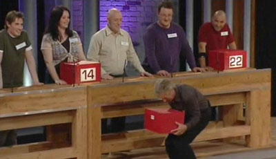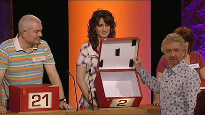 So goes the introductory spiel to this big money guessing game, of which international versions have already proven to be quite good fun. There are 22 numbered boxes, each one containing an unknown cash prize of between 1p and £250,000 and 22 contestants, who have drawn lots before the show to determine who gets each one. A 'randomly'-selected contestant is invited to sit in the hot seat and becomes the player for that show, bringing their box with them. The other boxes are then opened one by one, and an off-stage banker known as, er, "The Banker" offers the player money to buy back the box and leave the game, based on the values of the boxes left.