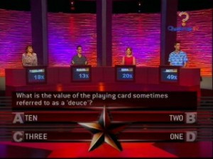 The questions in the first two rounds are Millionaire-style multiple choice. And it's here that the main eye-popping moment actually occurs. The computer graphic display for the questions is nothing short of a work of beauty, with a lovely 3D dissolve as questions gradually fade in and melt away. Additionally, the central red star (subliminal sponsorship for a courier company, we think) rotates as the correct answer gradually highlights. It's fab.