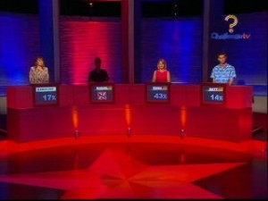 Defectors is in principle quite a cute idea for a game show. The audience (the aforementioned defectors) have to back which contestant they think will get a question right. The percentage vote for each player represents the number of points on offer to them for the next one or two questions. Both the winning contestant and the defector who most consistently backs a correct contestant wins 1000 royal portraits (well, if we still had a £1 note, that is). So the contestants can't win without the backing of the audience, and an audience member won't win unless they back the right contestant. Quite a nice dynamic.