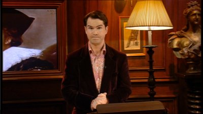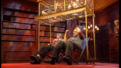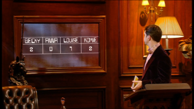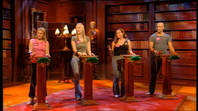 The studio is well decorated, and made to look like the library in a Georgian mansion. Two walls of the studio contain bookcases: one of these bookcases slides open to reveal a large square platform, on which the contestants glide into the studio. Mr Carr then introduces the contestants, states an embarrassing fact, and asks them to figure out to whom that fact applies. So far, so good: the slightly embarrassing fact is nothing much new, and the sliding platform and bookcases is a very good piece of visual television.