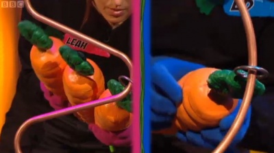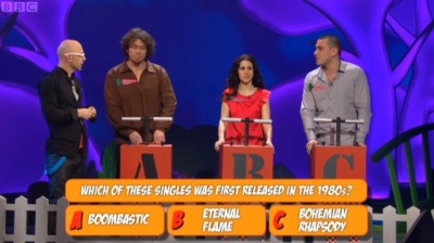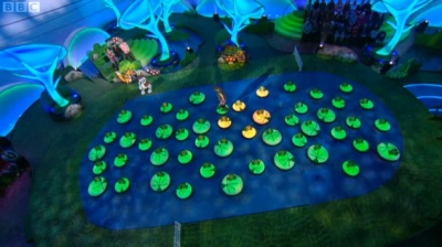 The other main technique is to make references that will go over six-year-olds' heads. Describe a contestant as looking like "a young Cher in wellies". Mention Fiona Bruce a lot (more a motif than a running gag per se). Refer to 20th century cultural phenomena, e.g. "Please be careful because we do not want another frog chorus. Oooh, that was a terrible song." (The generous interpretation would be that this is a multi-layered self-deprecating joke drawing parallels between Paul McCartney's "We All Stand Together" and this show, inviting the viewer to consider the difficulty of attempting to produce a work for children that will also appeal to adults. The realistic interpretation would be that it's a lazy sneer.)