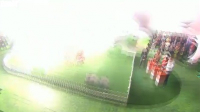 The setting is, apparently, an "underground forest", though it certainly doesn't look like it's underground, what with having a skyline, with clouds, a sun, moon, and photosynthesising flora. All of it fake, of course... but then again, for the "underground" to be a medium-aware reference to it being a TV creation, the studio would have to be underground in real life. Unless the point is that the real, overground studio set represents a fake, underground studio set, and frankly, we're not sure they're really going that meta.