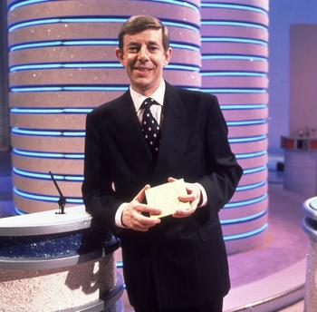 Henry Kelly and his questions cards.