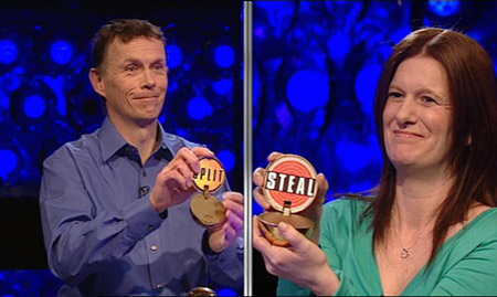 After they make up their row of five winners, they are given two final balls each: Split and Shaft Steal. If they both choose the Split ball, they share the remaining cash 50/50. If one chooses the Split ball and the other chooses the Steal ball, the Stealer gets all the cash and the Splitter gets none of it. If they both choose the Steal ball, they both go home with nothing. In later series, Jasper Carrott counted down from three before asking the players to reveal their Split or Steal balls. The distorted camera effect used to close in on the players is known as a Hitchcock zoom.