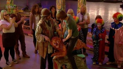 The final challenge was set with eight bins. In seven of the bins were life-changing prizes, like a balloon, or a plastic ruler, or an egg-box. In one of the bins was Cyril, a small and vicious clown. When he was found, he would come out and beat up the contestant. Whichever contender isn't beaten by a small and vicious clown is the winner.