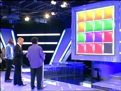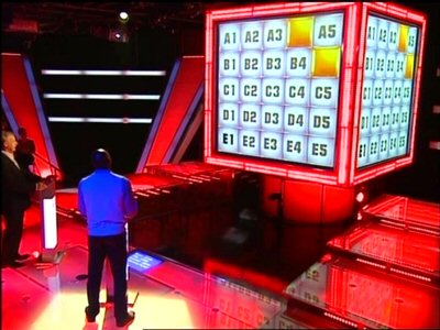 What's slightly frustrating about the whole venture is that, for a Channel 5 (oh, alright then, five) production, it's all been put together rather well. The innovative use of a cube rather than a flat screen for the game board works extremely well and, colour-balancing aside, looks marvellously sci-fi. There's an experienced host who doesn't grate, the audience is plentiful enough and well "donutted" around the studio, the typography and graphics are nicely consistent (although the on-screen scoreboard could do with some animation to demonstrate the contestants' money totals going up and down), there's even some computer-animated eye candy whenever the board revolves to its next position. Even the set looks about as nice as it could do on this kind of budget. Perhaps the level of prize money is a little disappointing, being at least half that of what Channel 4 are giving away.