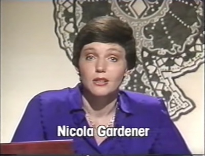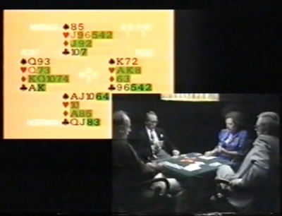 As the end credits helpfully told us, host Nicola Gardener was a tutor from the London School of Bridge, though that was rather underselling her credentials as a champion player even at the time. Now known as Nicola Smith, she's gone on to a long and distinguished career as a player; as of summer 2020 she's still the #2 ranked women's player in the world and her trophy cabinet has recently been classified as a dwarf planet by the IAU.
