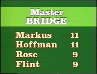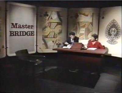 A duplicate bridge competition following the lead of the BBC’s Grand Slam, though unlike the Beeb’s series, Master Bridge was an individual contest, with eight players paired up with each of the others in turn. The concept was very much "learn about bridge by watching the masters" and although it wasn’t explained on-screen, the deals had been devised by host Nicola Gardener and series creator/producer David Elstein specifically to illustrate interesting situations and strategies in the game.