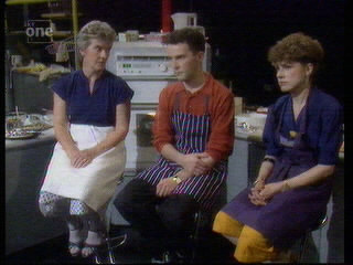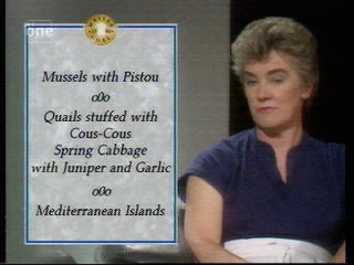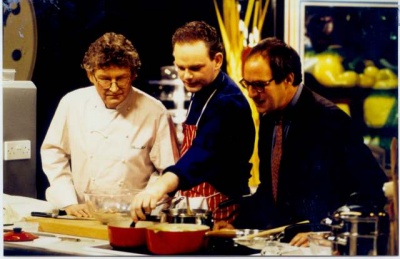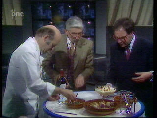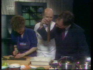 Also, not exactly a catchphrase, but a "big green 10" used to appear on the studio's video screen to indicate ten minutes' cooking time remaining. At first, Grossman referred to this as "the big green 10" but later on he would avoid using the word "green" and compare it to a different green vegetable each week - "asparagus-coloured", "petit pois-coloured", etc. Unfortunately, his reference to said digit all too often meant that he would interrupt one of the guests (usually the chef), which seemed a bit clumsy, not to say disrespectful - surely they could have streamlined the show a little better in order to allow all concerned to have a fair say?