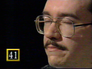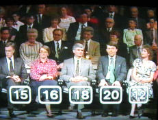 Halfway through the 1990 final. The contenders are, left to right: Brian Bibby, Helen Grayson, the champion-to-be David Edwards, Paul Webbewood and Chantal ThompsonAfter that, the scores are read out again and the winner declared. If two or more contenders are tied on points, the one with the "fewer or fewest" passes is declared the winner; if there's a tie on passes too - a very rare occurrence - then there is a "sudden death" tiebreaker in which the contenders separately face the same five questions and whoever gets the most right, wins. The winner goes through to the semi-finals, the four (later six) winners of these going through to the final for the chance to win the engraved punchbowl which signifies the title of Mastermind champion.