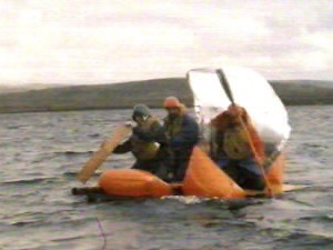 One team rows across a lake using their home-made raftAlong their course, they were a series of mental and physical challenges that had to be overcome before they could proceed. These could vary from creating a simple machine to opening a strong wooden box covered in 1000 screws to moving a huge boulder. Often the solutions to the problem were much simpler than they appeared, but that didn't stop the teams making a right pig's ear of them on regular occasions.