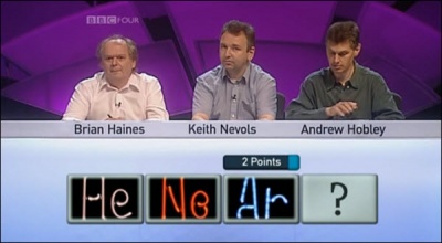 The final word game, Missing Vowels, requires the contestants to buzz in when they can identify phrases, names or titles from which the vowels have been removed and the consonants re-spaced (e.g. THL NN GTWRFP S for THE LEANING TOWER OF PISA), appearing in batches of four connected clues. It doesn't particularly fit in with the rest of the show, but overall the rounds provide sufficient variety to hold up the interest. Incorrect answers incur the double whammy of losing the team concerned a point and seeing the clue offered to their opponents.
