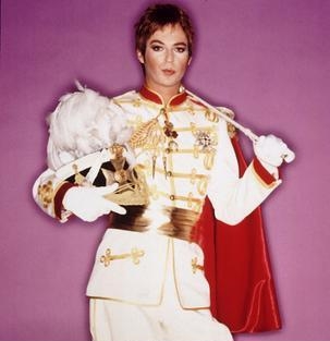 Julian Clary, staring at a camera.Then there would be an Arty round where they would be required to paint something. When they were in Australia, they all dressed up as "Their most famous person" (Rolf Harris) and they were required to paint a picture, a day at the farm, using as bigger brush as possible and they would have until "I get bored". They would then be marked, sometimes out of ten, sometimes out of as many as he feels like but generally, the worse it is, the more the audience cheer (because they like the outsiders) and the more marks he'll give them generally.