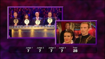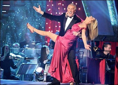 Renowned song-and-dance man Bruce Forsyth was the original host, though he didn't get to do much dancing, which seems a bit of a waste. Each celeb has been paired up with a professional dancer, and we get to see clips of them in rehearsal before they take to the floor to perform. After a minute and a half of dancing, their performance is appraised by four judges - the nasty one, the camp one, the old one and the Hot Gossip one (latterly, the seemingly underqualified one) - then they go off into the backroom (the transition originally covered by Brucie telling a joke that would invariably fall flat, but later he would just do a simple link) to be grilled by Glamorous Lady Co-Presenter and watch as the judges reveal their marks out of ten. Repeat until all the couples have danced.