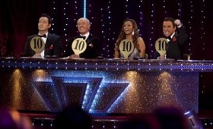 Since Alesha Dixon joined the panel, it's become a common ritual that after giving a ten, and just before the camera goes off the panel, the judges will either fan themselves, or start hitting each other with the paddles. Even Craig, who usually eschews such fripperies (and doesn't often give 10s anyway), joined in with hitting Len in the 2010 final when Len was the only judge not to give 10 for Kara Tointon's american smooth.