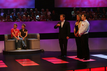 Three couples vie to win "up to £50,000" (but see below). One couple definitely get to play, decided by a method we're not let in to. Their first decision of the night is to select their opponents - there are two couples backstage. Team one are shown a couple on the video wall and given a brief description. They must choose to take them, or indeed, to leave them and face the unknown quantity.