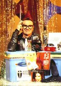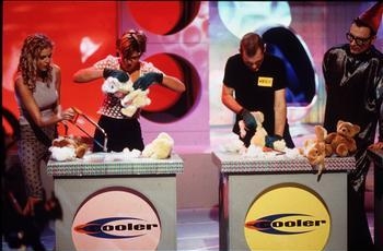 And whilst that was being sung, the Quiz Wizard was in a filmed piece pointing out the prizes, except it was badly synched so that he was never pointing to the prizes being described. The Kingdom of Prizes was a race in baby bouncers around the studio and the mystic giant cans of hairspray. The contestants started in a place depending on what they scored in the last round and they ran to the bouncers, put on their safety helmets ("because safety is paramount in The Kingdom of Prizes") and raced. And whoever won was 'The Cooler King/Queen'.