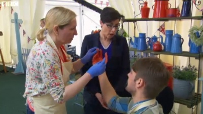 Eventual champion John's injury during the strudel challenge in Series 3, which led to him being taken off to hospital, and nobody being eliminated that week. "He had a blood glove!"