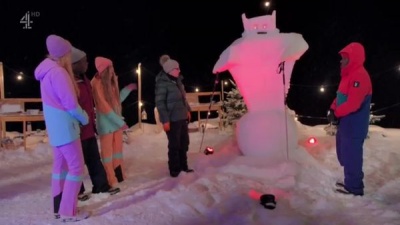 Final challenge is to build a snowman. Literally, carve a sculpture from out of another giant block of compressed snow. These are all-day tasks, and the celebrities have the assistance of experienced snow sculptors to help with the manual labour.