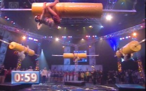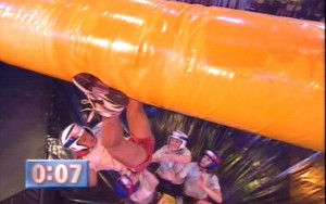 On me 'ead, sonFriends Up - This is in fact the best thing in the whole wide world ever. A team of six have to try and hoist four of their own up onto mustard-coloured "sausages" placed at varying heights. They do this by literally throwing their team members in the air "Bumps"-style and, providing they've managed to chuck them high enough, the team member has to grab hold of the sausage for dear life. If the team manage to get people on all sausages (and this gets harder as there are less people to help chuck, remember) the two people left have to run off the mats as quickly as they can and begin a ten second countdown.