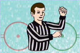 The show starts surprisingly, with Manchester making a missignal, and St Hilda's picking up a couple of starters. The phrase "Your bonuses are on dunces, St Hilda's," might have a ring, but that would be too cruel - we're laughing with Thumper this week. The first picture round is Name That Ice Hockey Foul, allowing Manchester to make a bit of a comeback. And no, the last picture (right) was not "Failure to perform Blockbusters dance between periods" - for that foul, the fingers on the higher hand should, of course, be pointed.