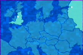 This helps Nottingham to get 50 points in two rounds, before the Business students have even got off the mark. Is it, we wonder, entirely fair for consecutive starters to ask about tides of North America and the "Hands Across America" event when only one of the players comes from New York? And is it entirely fair to ask people to deduce which UK city is represented by the dot on this map (right)? It does, after all, cover at least a quarter of the teams in England's top football division. LBS get Manchester on the second guess, and trail 50-40 after the first visual round - it's on twin cities.