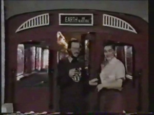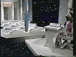 Another edit sees us back in the main room, where the two are discussing with Ganord; clearly, they're beginning to run out of time before the studio hands call a halt to proceedings. Daviod types "wisdom" into the computer. Apple II computers aren't too familiar with earth languages, particularly when he's typed "wwisdom". "Wisdom" is the password, but it's too early - they've got to get the right time. "Time for T" says Madeleine.