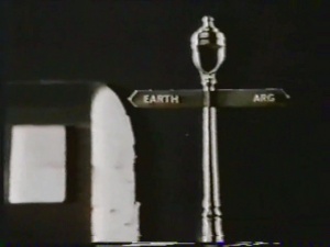 Lesley and Ganord adjust the scoreboard: counting evaporations from the previous series (Earth 7, Arg 8), it's now Earth 9, Arg 12. Ganord muses that it'll be a cold night, but someone will come along and give Madeleine and Daviod a lift. They're at a sign-post on the journey, and try to flag down the Arg shuttle.