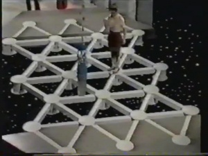 Lesley Judd shrieks, Madeleine Smith says that she won't say anything, which is hardly different from the rest of the programme. David Yip queries the rules, and Derek Gale asks if there really was a mole, and says that this is where they start the accusations. Ganord says that the group has one minute, the lights go down to a spooky level, casting long shadows, and some dragons appear - in dragon form, no less - to intimidate the contestants. Viewed from a somewhat later point in history, we wonder if this little scene can claim to be a predecessor to the popular party game of Mafia, and if the short series Traitor (2004) was timed to air in the same 6pm slot. The timeslot is a coincidence, surely.