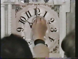 Another edit, and Daviod's thumbing through the Book of Signals they found late last week. Is the semaphore picture on the wall of any use to them? Maybe: what if they put the semaphore signal for "T" on the clock. The face is locked, but the "Time for T" key opens it. The code is (roughly) 10 o'clock, the clock chimes, and then it quacks. The computer screen reads, "Please enter the password now".