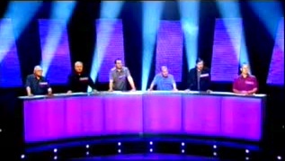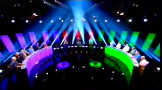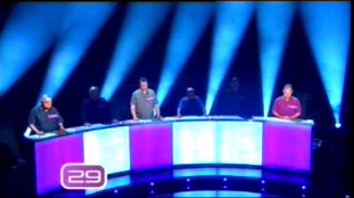 From a strict quizzing point of view, we rather like this show. It's a magpie format, nicking the best bits of other shows and melding them into something greater than the sum of its parts. The presentation, sadly, is a little less inspired. There's a video wall running around the outside, used mainly to display the name of the next round and provide some eye-level colour. There's a lot of spotlights, and an overhead shot of two podia that gets a little tiresome through overuse. We're particularly unimpressed with the font used on the show: it's trying too hard to be modern and cool, and succeeds in neither endeavour. Bonus points, though, for colouring the teams purple and lime, rather than green and red.