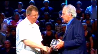Mrs. Bell, clear a space on the mantelpiece, you've got a great present. The trophy is presented by that television sports legend Des Lynam, who leaves with a quick goodnight.