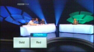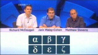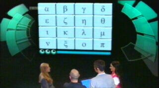 There are three groups for each team, and they select them from a board. Nothing so common as numbers on this board – no, the questions are hidden behind Greek letters. While we like the idea of making sure the team know what they're talking about, and penalising stabs in the dark, we're not entirely convinced that using Greek letters sets the right tone: it gives critics a spurious excuse to bash the programme for elitism, when this is simply not present. There is a channel for people to watch brain-dead fluff – indeed, there are a million channels for people to watch brain-dead fluff. There are very few channels where viewers will expect to spot Pythagorean triples, let alone understand them without much further explanation.