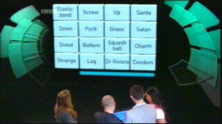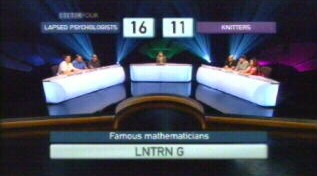 Like many other viewers, we were shouting at the television set during the Wall, pleading with them to try combinations of quarks and captains (pick four from five) but they seemed to ignore us. Other viewers will, no doubt, be able to get one of the groups on the wall, and holler at the team. This can't be done on University Challenge, where most viewers will be patting themselves on the back after getting one question right.