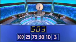 There is a game in there, and we begin with a rather bad omen, James offers ERRORS (which is legal) as David's RESHOES* is found not to be in the dictionary. It's good that the default shot of the contestants includes their name tags, perhaps less good that the letters and the board they're being put on and the hostess are all wearing similar shades of blue. After a low-key opening segment, the contestants find the first numbers game trivially easy, and spend about 27 seconds bantering before inviting Rachel to solve the game. James leads, 35-29, as Andrew Sachs delivers the anecdote.