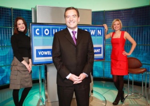 Good grief, they've had the decorators in over the break. The set is now a shade of blue, with letters and numbers gently displaying in the background. It's far better than the old stripey set, and we understand that if you view the new one from the right angle, it looks like the Channel 4 logo. Des O'Connor has also had a makeover, he's got a slight north-eastern twang, and Carol has gone blonde and adopted a clear Essex accent. It also looks like she's had some years off of her. What? They're not Des and Carol. Lummee. It's Rachel and Jeff.
