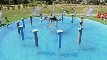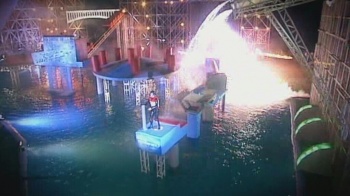 Eventually, the first round has ended, and eight people have proven good enough at falling in the water and not finishing the course to be sent home. The remaining twelve are put on small pedestals in the middle of a lake, and invited to jump over a rotating arm. The arm, we're assured, gets higher and spins faster. The first six people to be knocked off their perches and into the water are out of the game, the remaining six continue for the sheer desire of filling a bit of time. Mr. Hammond gives some slow-motion replays to explain what happened; in the confusing first rotation, this is worthwhile, but there are only so many variations on "...and he just didn't get his leg over."