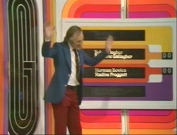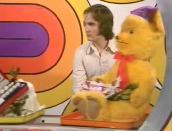 He gets to go behind the screens, which open, and a conveyor belt of goods appear in front of them – there's a slide projector, a radio, a coffee pot, a cuddly toy, fondue set, perfume, hair curlers, stereo, a camera. After he's seen them, he gets 45 seconds to recount whatever he can remember. Whatever he says, he wins. The show ends very quickly, with the winner shown in front of his prizes.
