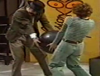 | In 1971, Clive Doig joined the Vision On team, to direct one programme. He'd already spent something over a decade as a cameraman and floor manager. Dowling spotted Doig's genius, and the pair worked together as a team for the next six years. Each week's show had a central theme, and it was a year's work to piece together the sixteen shows for transmission in the spring. The programme was ambitious, perhaps too ambitious: one plan that never quite came off was to convert a gasometer into a giant birthday cake, complete with an oversized candle on top.