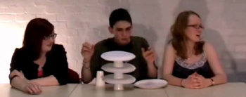 | Round three, the Accumulatower, follows close behind. In this round, the team is given general knowledge questions for 90 seconds, which is entirely ordinary. There are no points awarded for correct answers, which is somewhat unusual. Instead, a correct answer allows the team to start building a tower out of plastic cups and paper plates. Put a cup on the table, put a paper plate on top of it. Put another cup on top of the plate, put another plate on top of it.