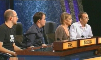 Instead, let's point and titter in the general direction of the mathematicians, who convince themselves that "Kojak" is a palindrome, reading the same forwards as back. However, they do get definitions of the mathematical constant pi, and neither side gets the audio round on songs re-written from German – we can honestly claim three points there. The mathematicians could also have claimed three on a question about things with three lines, but a little timidity cost two points. It's 3-1 after the opening exchanges. Round two turns out to be pivotal: the mathematicians take a plunge on common road names, and not only are they happy to confess their knowledge of Thomas the Tank Engine to the millions viewing, but they say they were rehearsing just this question on the trip to The OC's sun-drenched studios. The wordsmiths strike back with vitamin deficiencies, but zig with "era" when the geological timeframe is "period". The mathematicians also ride their luck on international dialling codes, to lead 10-3. |
