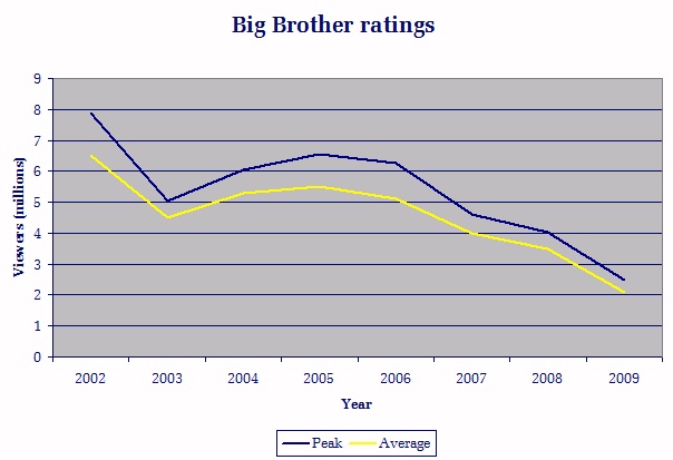 Big Brother seemed to move closer to death this week. Following blatant and repeated breaches of the rules by most of the contestants, the producers allowed them to openly discuss their nominations. Big Brother has been in decline for a few years now, and we've got a graph to prove it. Viewing figures for the first two series aren't comparable with later years, but averaging the first week in July shows a decline from 6.5m average (7.9m peak) in 2002, then four years around 5m before falling to 4m, 3.5m, and just 2.1m this year.