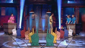 During this grand final, it's clear that the show has begun to run out of creative zest. If the opening challenge would go down in The Crystal Maze as a physical test, and the ones between tend to a skill game, a mental game, and one that defies categorisation, this final is the bit where we realise the team's only got three crystals in their last zone and can't possibly win. It's wordy and drags on and on and really rather sucks the life out of the show. Could we have had another more physical game, perhaps something out of the Friends Like These stock? We've said in the past that gunge is the last resort of a children's television show, something to throw at the contestants when there's nothing left in the creative bag. On Keep Your Enemies Close, getting gunged is the consolation prize for the losers in the final. Once they pass the "Clag Barrier" – the last pair of hands – their opponents can send the railway car down the line, and under some tubes containing various coloured gloop. The winners receive hand of friendship medallions, solid silver hands on a chain – one has the left hand, one the right. This game isn't about the prizes, but the taking part. Get 100 it's not. |