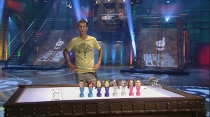| We're not entirely convinced by the set design; the challenges call for a large open space, and the set is built around a large open space. At one end are two giant ramps, leading up to a walkway, on top of which is a giant revolving drum. This is known as The Mixer, and it's the device by which the producers announce the new teams to the contestants. Off in one corner is a table, containing representations of the players – oversized heads on puny bodies are another Dadaist motif. These chips are used to illustrate which contestants are playing together, and an excuse to rattle off some anecdotes that might explain how the pairs will work together. Or, more likely, some anecdotes that might pad out the programme to the required length.