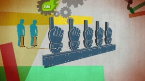 | The grand final sees the winning pair split up, and their original team-mates released from lockdown. They're put in open coal wagons, on railway tracks with hands blocking their path. (And, let's be honest, very noticeable remote-control cables). In the final, each pair is given a letter of the alphabet and a category, and five seconds to come up with two answers from that category beginning with that letter. Fail, and they move down the track, knocking down the next hand. Succeed, and the opponents will progress. If they've got this far, the winners of Tube Strike can use their "Hand of Friendship" token as an automatic correct answer.